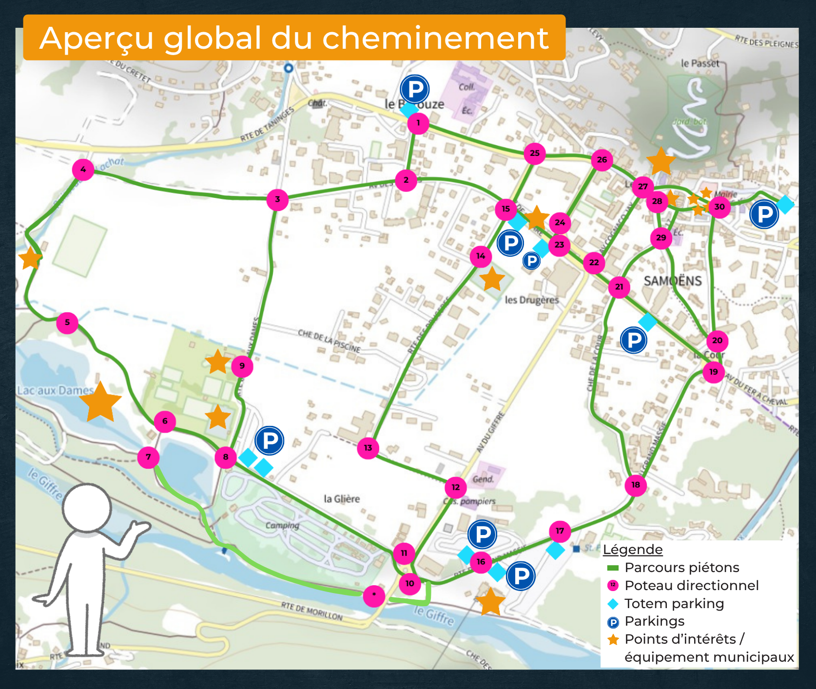 Plusieurs échanges entre la mairie, l’office de tourisme et l’association des commerçants ont permis d’en définir les orientations : capter l’attention des véhicules en traversée, faciliter le stationnement en identifiant clairement les parkings principaux, et encourager les déplacements piétons en reliant les principaux pôles d’attractivité grâce à un parcours fléché.