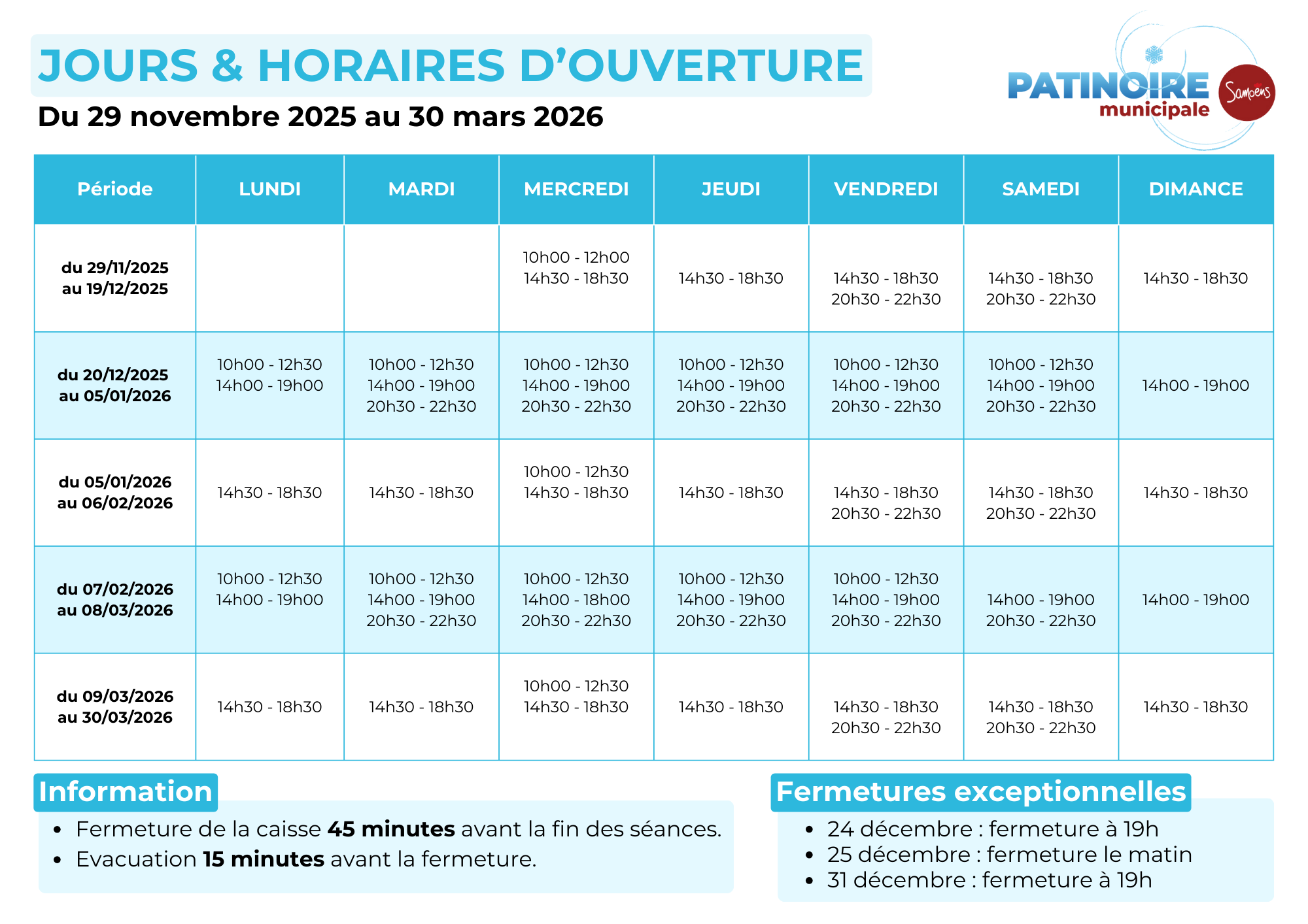 Cet hiver 2025-26, la patinoire sera ouverte du 29 novembre 2025 au 30 mars 2026 (6 avril si les conditions le permettent).